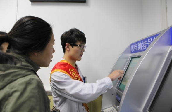 (志(zhì)願者教患者使用(yong)自助挂号機(jī)挂号)
