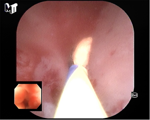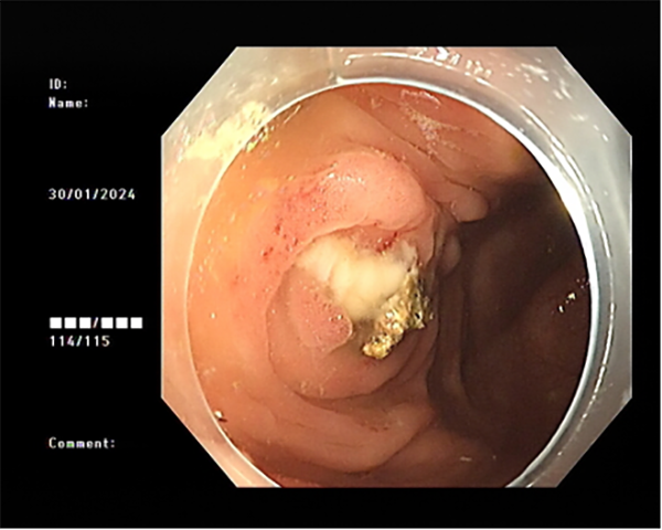 患者李某因慢性腹痛、腹瀉來消化內(nei)科(ke)就診,在(zai)腸鏡檢(jian)查過(guo)程(cheng)中(zhong)髮(fa)現(xian)患者闌尾開口處明顯腫脹、充血,并有(yǒu)白色膿液排(pai)出,進(jin)一(yi)步完善(shan)腹部(bu)CT後(hou)明确診斷(duan)闌尾炎、闌尾糞石嵌頓。征得患者同意後(hou),在(zai)邸雅南(nan)主(zhu)任的(de)帶領(ling)下,張波(bo)副主(zhu)任咊(he)康奎、青勝(sheng)醫(yī)生(sheng)等(deng)團(tuán)隊(duì)成(cheng)員(yuan)通(tong)過(guo)腸鏡活檢(jian)孔道送入“洞察”子(zi)鏡(經(jing)口膽道鏡)進(jin)入闌尾腔,清(qing)晰觀察見到(dao)闌尾腔粘膜明顯充血、糜爛,并見大(da)量膿液,闌尾中(zhong)段狹窄,擴張狹窄後(hou)膽道鏡越過(guo)狹窄段到(dao)達闌尾底部(bu),見一(yi)塊狀黃色闌尾糞石,應用(yong)取石網籃成(cheng)功取出糞石,并将闌尾腔內(nei)全部(bu)糞石殘渣沖洗幹淨。術(shù)後(hou)第二日(ri)腹痛明顯緩解并出院。